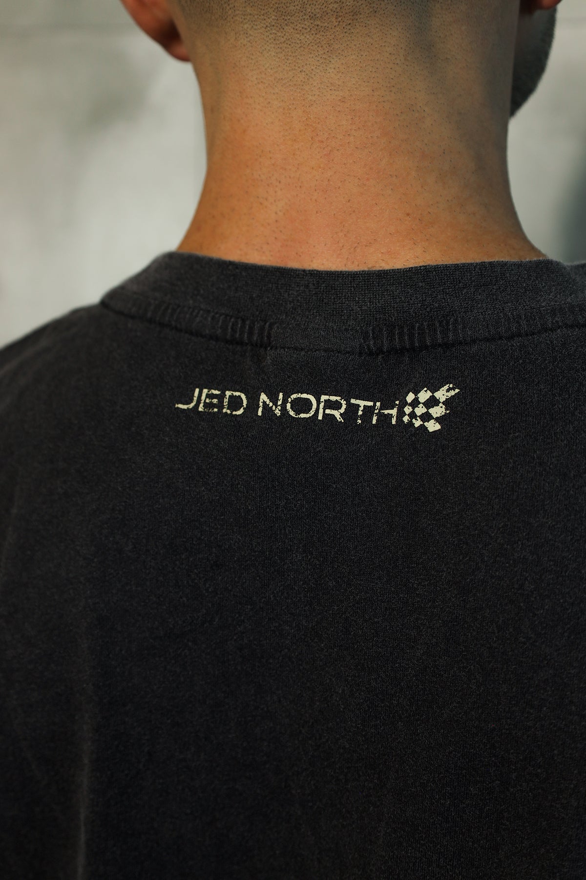 • Stitched logo under left arm sleeve and back distressed classic Jed North logo